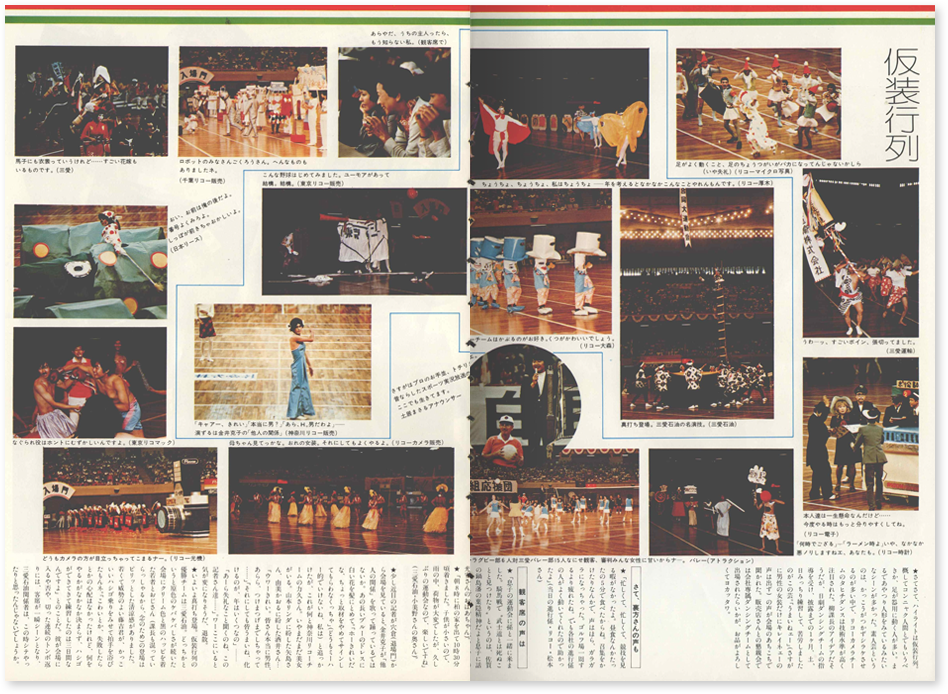 1954年から続いてきたリコー三愛グループ合同の大運動会は、1974年の開催が最後になったんだ。(この6年前の1968年に開催された運動会はボクも見に行ったんだよ。)最後の運動会ということもあって、社員やそのご家族も含め11000名が参加したんだ。この大人数が入れる場所ということで、会場はなんと武道館だったんだよ!今考えるとすごいことだね!